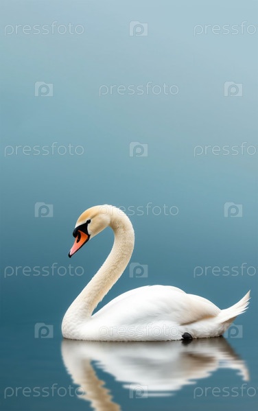 Лебедь с отражением в воде на пастельно-серо-синем вертикальном фоне