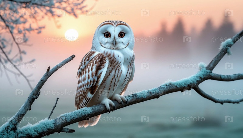 Снежная сова, сидящая на ветке в тумане на рассвете. фотореалистическая иллюстрация