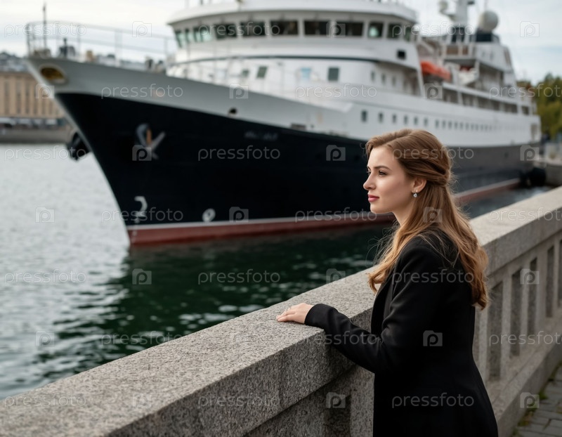 Молодая женщина на доке смотрит на лайнер, ожидающий