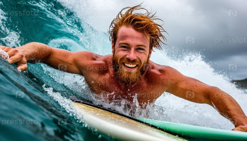 Красивый краснокожий мужчина с бородой в море на доске для серфинга в пасмурную погоду