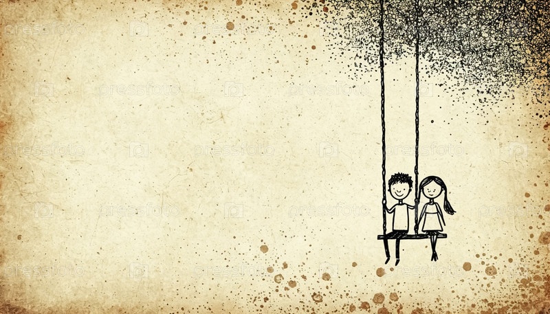 Романтическая винтажная фоновая карточка с боковым рисунком мальчика и девочки на качелях