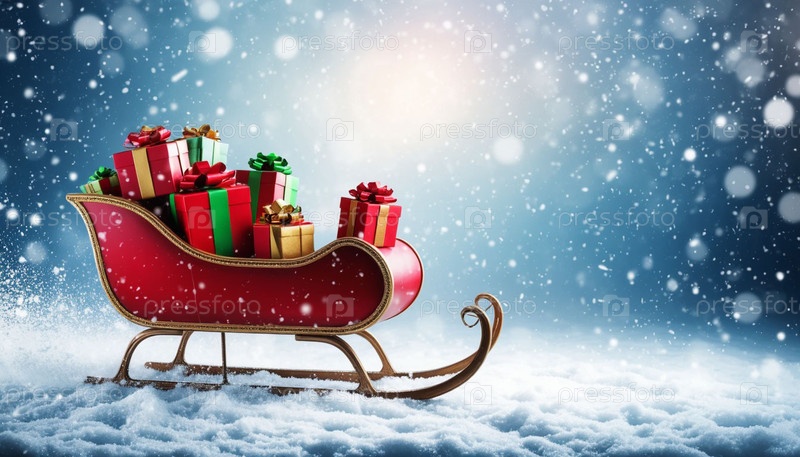 Красные санки с подарками на снежных кусках Новогодний фон Генерация ИИ