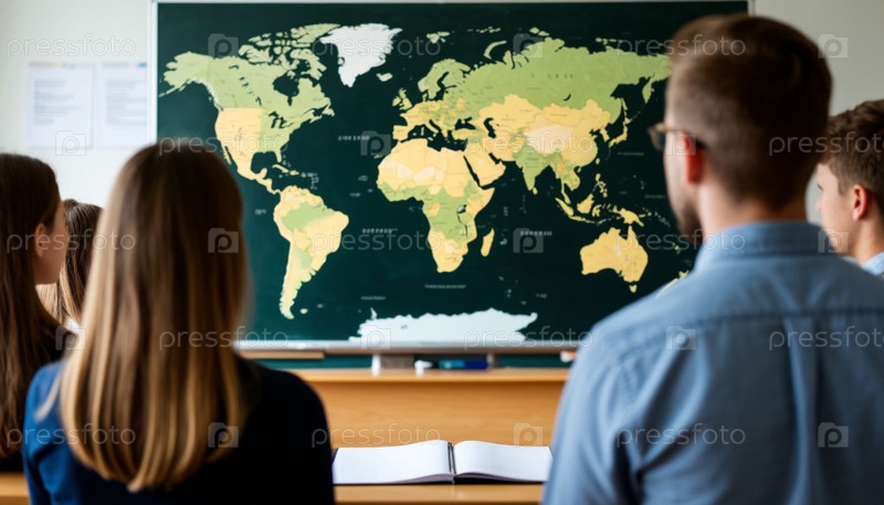 Студенты в классе и карта мира на доске