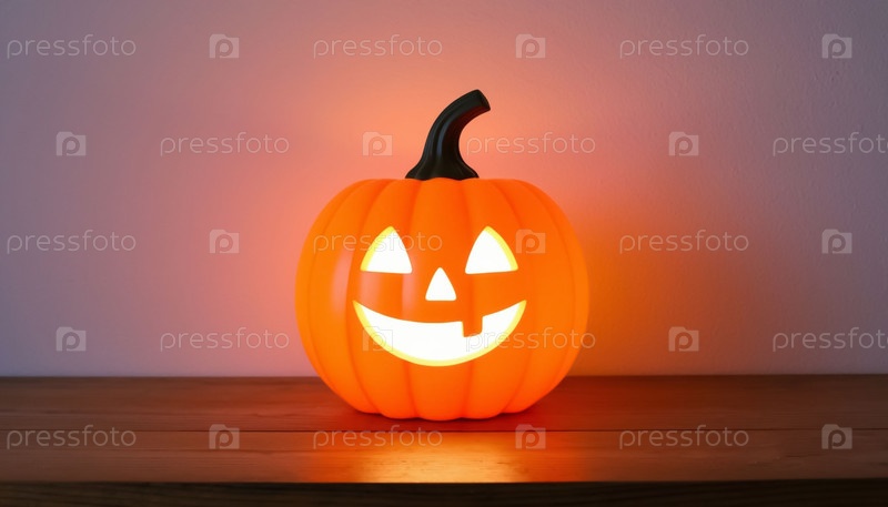 Лампа в форме тыквы на деревянной столешнице на минималистическом фоне