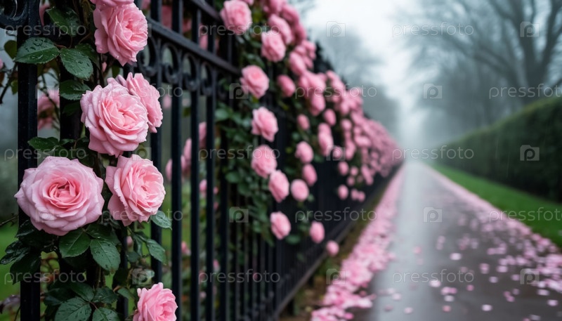 Подъем роз на металлическом кованом заборе, саду, тумане