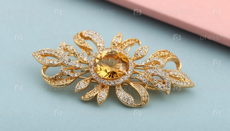 Золотая брошка с камнями на минималистическом пастельно-синем фоне, пространство для копировки