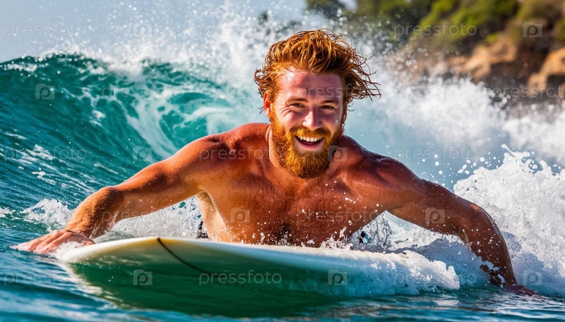 Красивый рыжеволосый мужчина с бородой австралийский в море на доске для серфинга в солнечную погоду