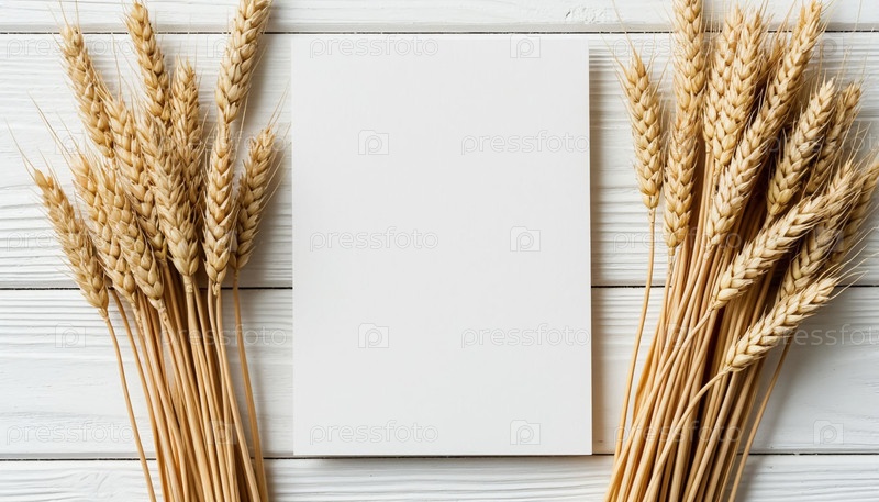 Белый шаблон открытки на белом фоне и пшеничные колосья