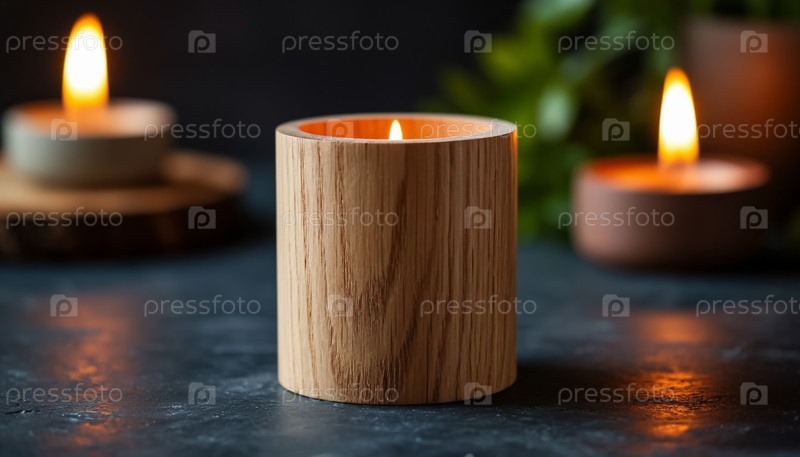 Декоративная свеча на столе в деревянной подставке