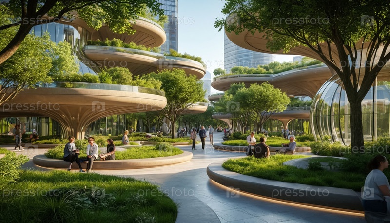 Зеленый парк в экологическом футуристическом городе будущего