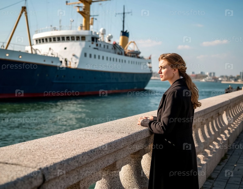 Молодая женщина на доке смотрит на лайнер, ожидающий