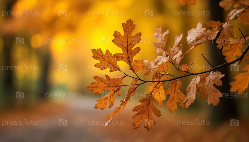 Осенний размытый фон с ветвью листьев на переднем плане