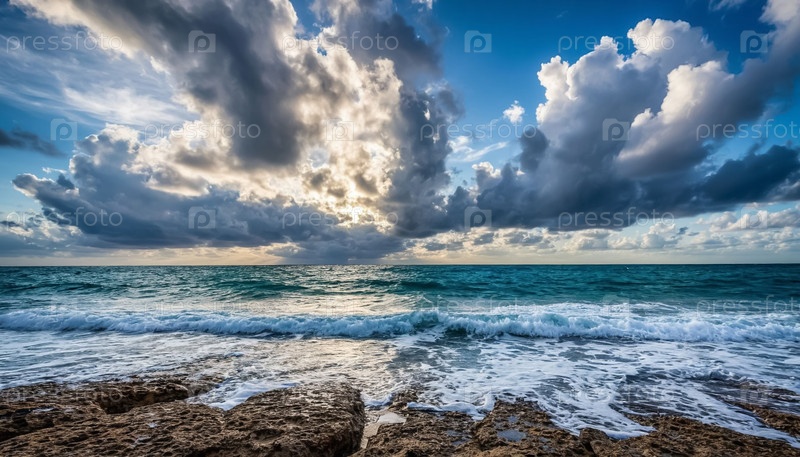 Морской пейзаж с скалистым берегом. драматический шторм, облака