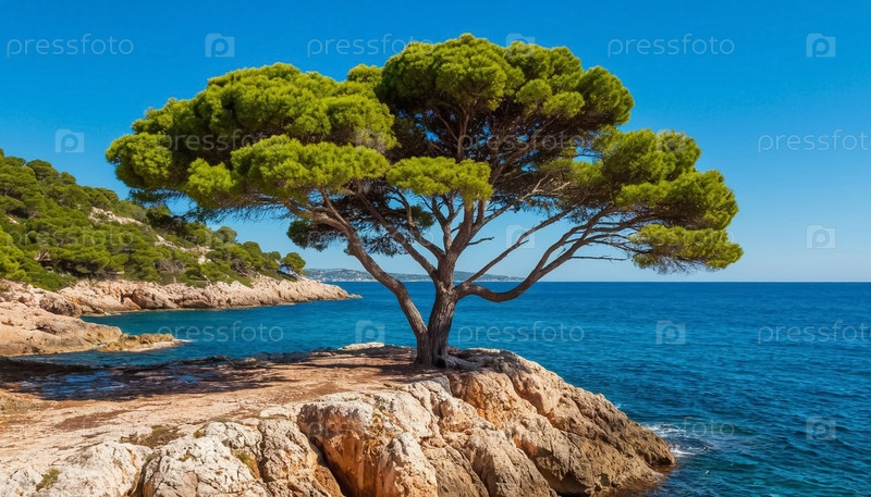 Прекрасный морской пейзаж и одинокое дерево на скале