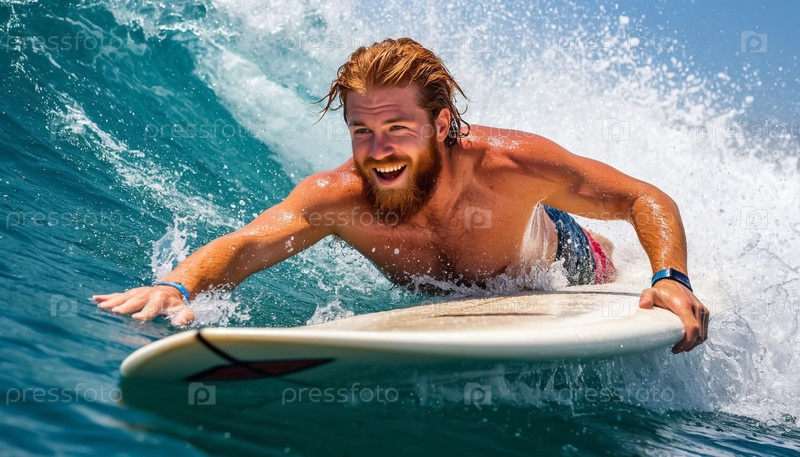 Красивый рыжеволосый мужчина с бородой австралийский в море на доске для серфинга в солнечную погоду