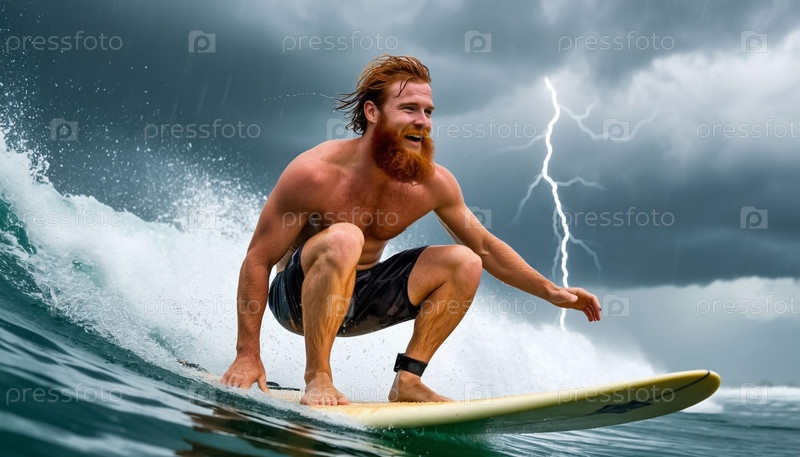 Красивый мужчина с красной бородой в море на доске для серфинга во время шторма и грозы