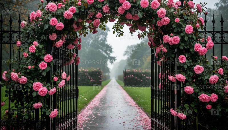 Подъем роз на металлическом кованом заборе, саду, тумане