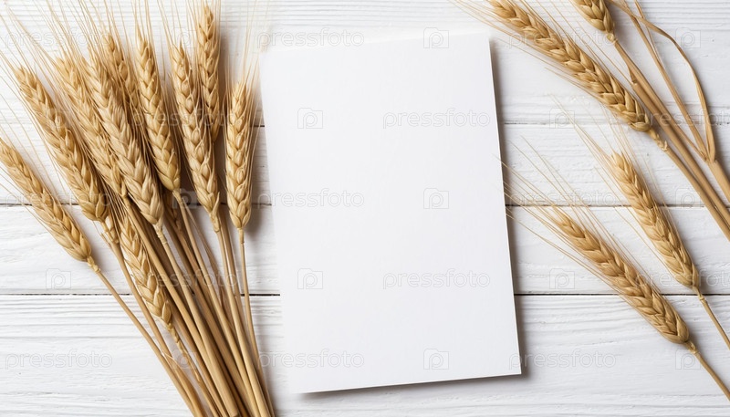 Белый шаблон открытки на белом фоне и пшеничные колосья