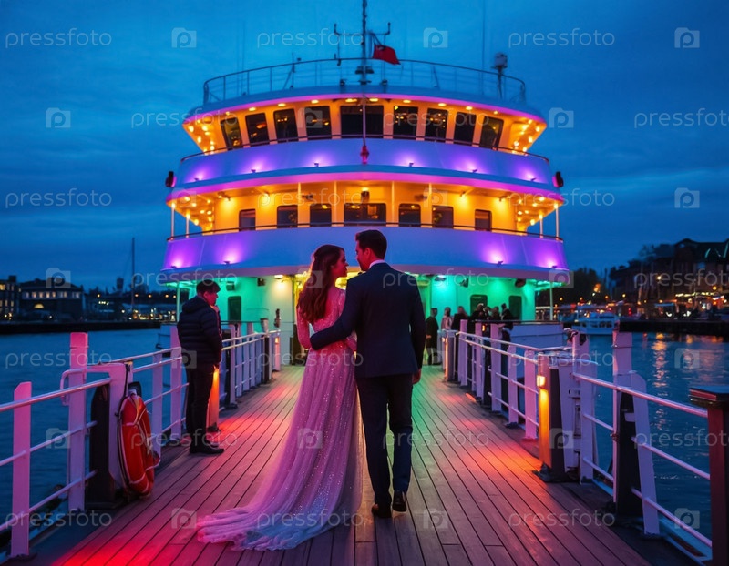 Пара на круизном лайнере во время вечеринки, красочные огни на палубе