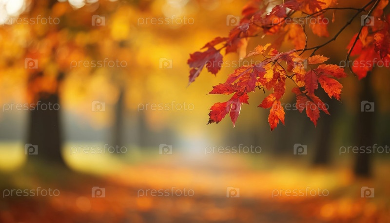 Осенний размытый фон с ветвью листьев на переднем плане