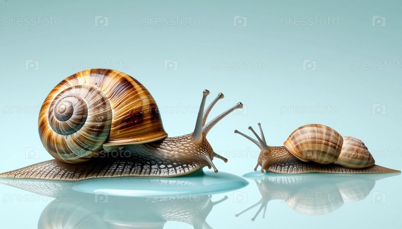 Две улитки мама и ребенок на капле воды на пастельно-серо-синем вертикальном фоне