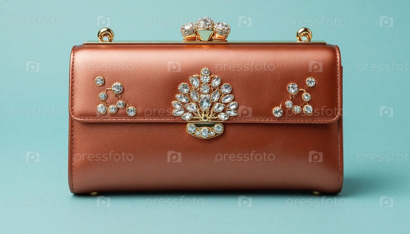 Женское кожаное сцепление с декорациями на пастельно-синем фоне