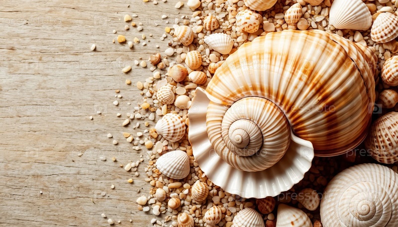 Раковины на минималистическом фоне, вид сверху, естественная текстура, копировальное пространство