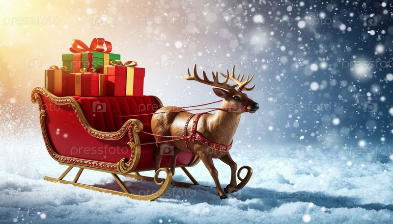 Красные санки с подарками на снежных кусках Новогодний фон Генерация ИИ