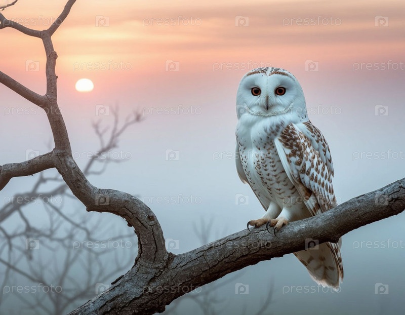 Снежная сова, сидящая на ветке старого дерева в тумане на рассвете. фотореалистическая иллюстрация