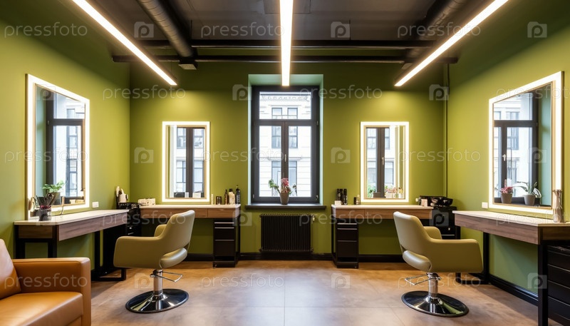 Интерьер салона красоты в пастельных фисташках и кофейных тонах
