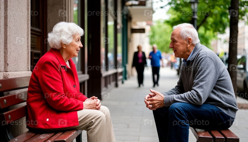 Пожилая пара, бабушка и дедушка разговаривают на скамейке возле своего дома