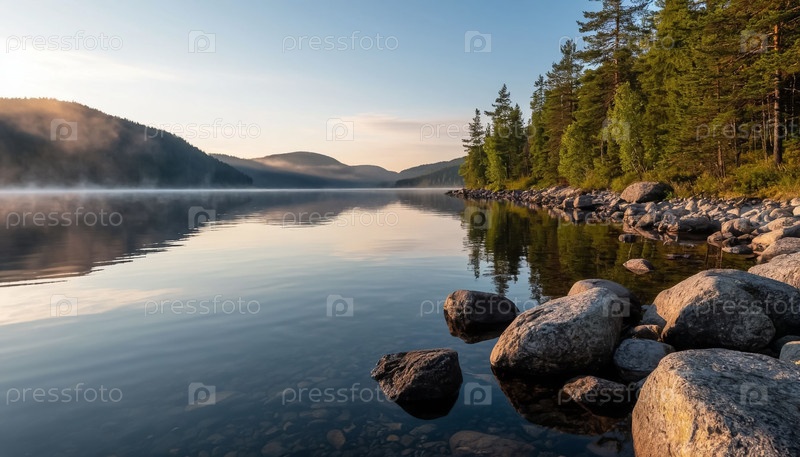 Большое озеро с скалистым берегом, валунами, туманом утром