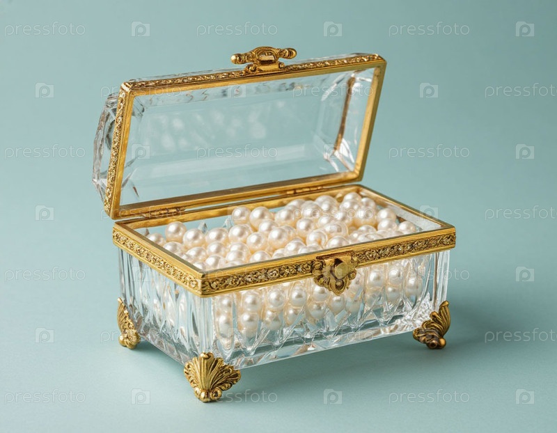 Кристальная коробка с жемчужинами на пастельно-серо-синем фоне