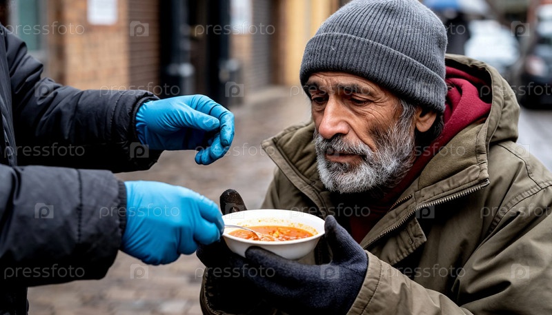 Бездомный получает еду на улице от добровольцев, созданных AI