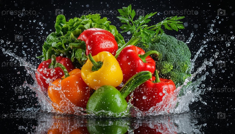 Овощи брызгут водой на темном фоне