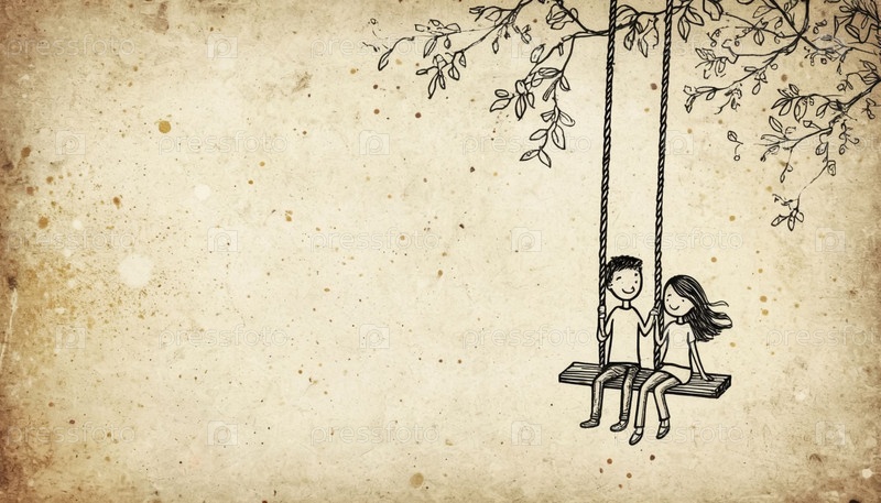 Романтическая винтажная фоновая карточка с боковым рисунком мальчика и девочки на качелях