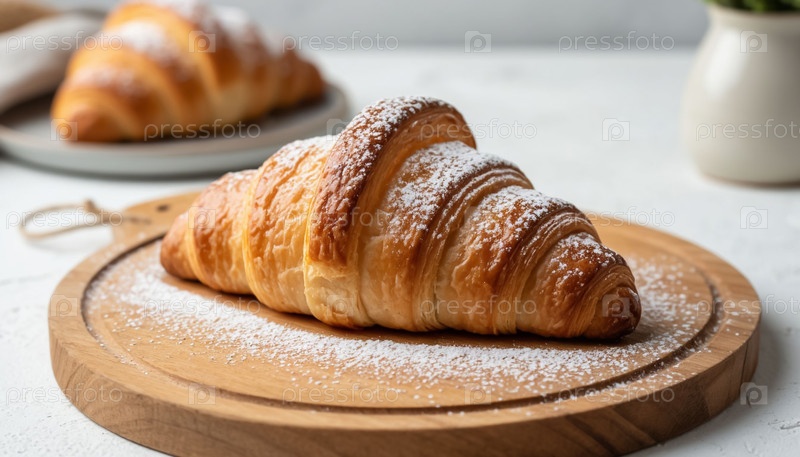 Хрустящий золотой кроассан на деревянном стойке