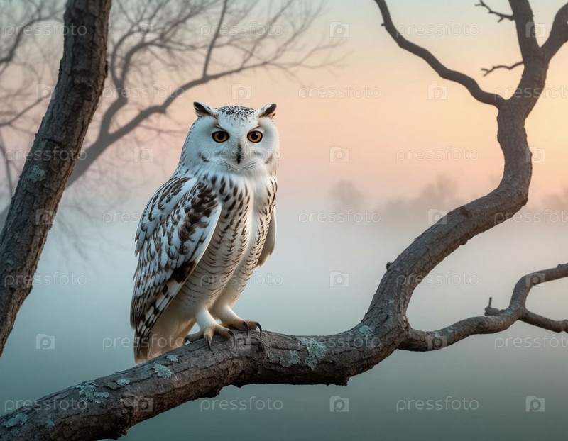 Снежная сова, сидящая на ветке старого дерева в тумане на рассвете. фотореалистическая иллюстрация