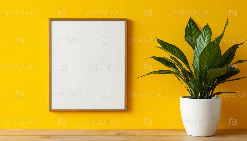 Пустая белая рама на желтой стене и растении