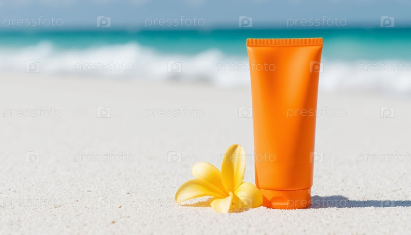 Солнцезащитный крем желтый на морском пляже с белым песком