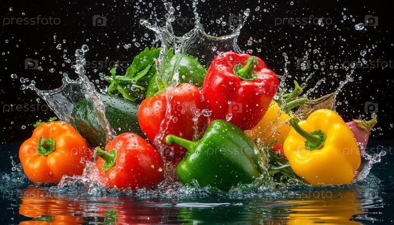 Овощи брызгут водой на темном фоне