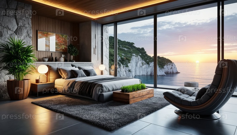 Высокотехнологичный интерьер спальни с панорамными окнами и видом на горы и море