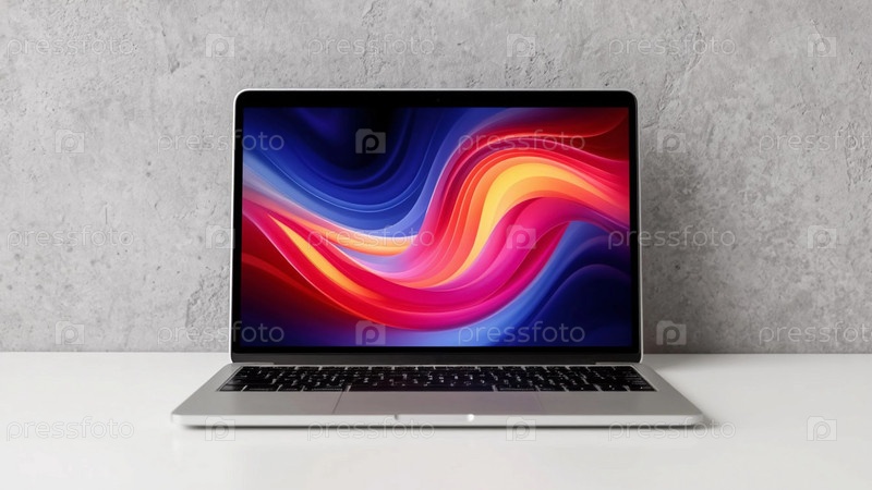Ноутбук с абстрактным заставлением экрана на мониторе на минималистическом белом фоне