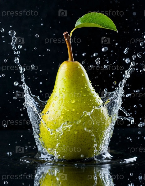 Груша в брызге воды на темном фоне