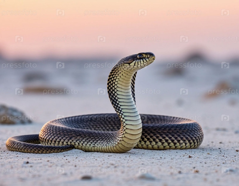 Змея кобра в пустыне возле камня на белом песке на рассвете