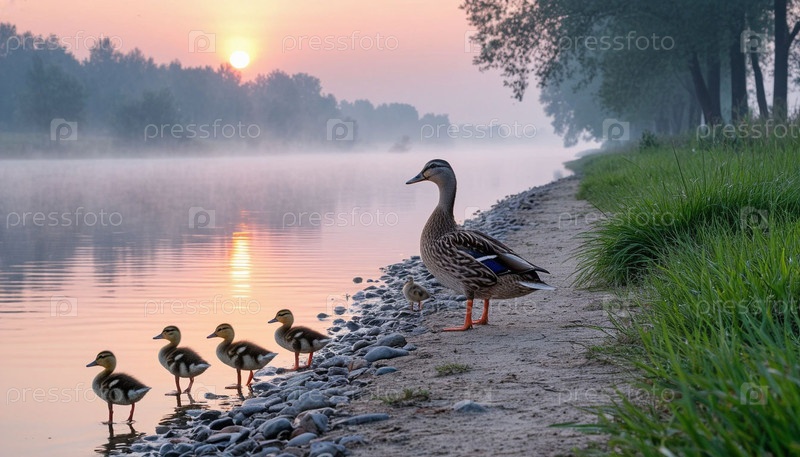 Утка с утками на берегу реки на рассвете