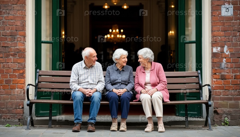 Дедушки и бабушки разговаривают на скамейке рядом с домом