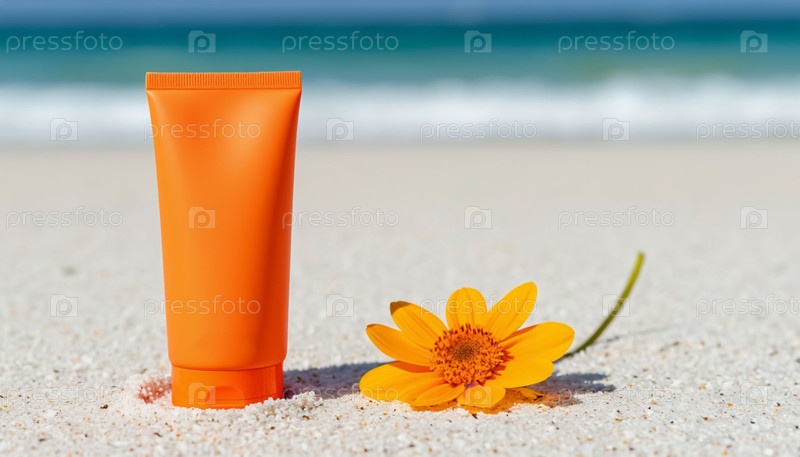 Солнцезащитный крем желтый на морском пляже с белым песком
