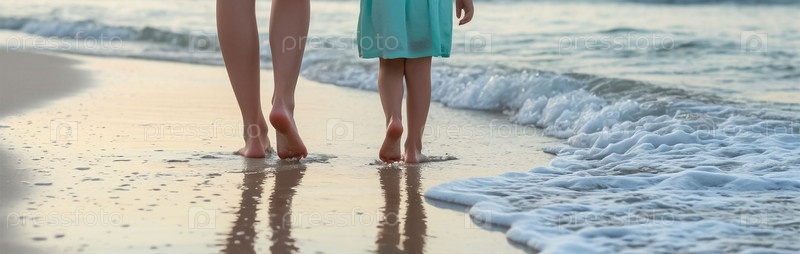 Ноги матери и ребенка утром ходят вдоль берега