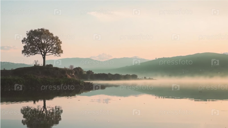 Одинокое дерево у воды в тумане. тихий минималистический пейзаж